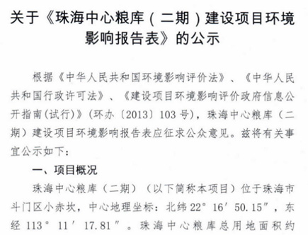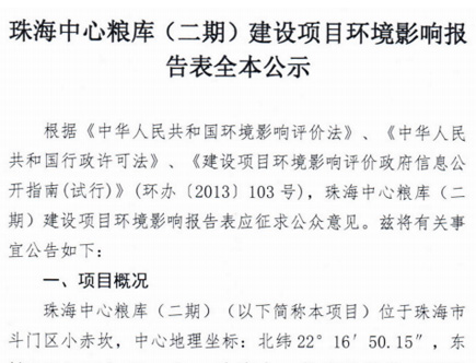 关于《珠海中心粮库(二期)建设项目环境影响报告表》的公示